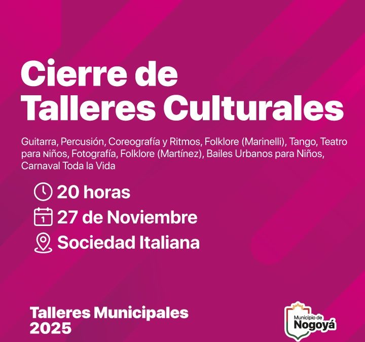 Desde la Coordinación de Cultura, Turismo y Educación municipal, invitan a participar del cierre de los Talleres Culturales Municipales de Taller de Guitarra; Percusión; Coreografía y Ritmos; Folklore (Marinelli); Tango; Teatro para niños; Fotografía; Folklore (Martínez); Bailes urbanos para niños (Quinodoz) y Carnaval Toda la Vida.